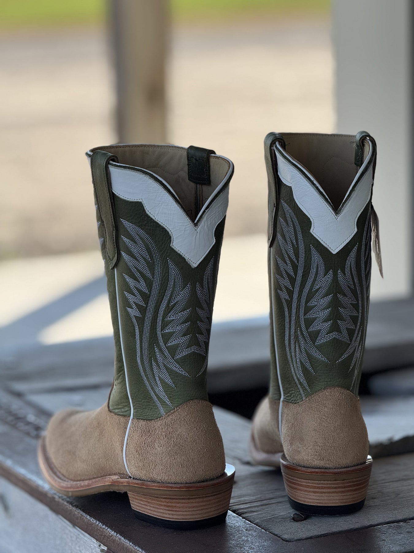 Vamp: Tan Victoria Roughout | Top: Sage Pebble Green | Color: Tan/Sage | Top Height: 13" | Collar: White Damian O | Toe: #1 | Heel: C Long | Sole: Tan Ranch Tough | Proudly made in the USA | SKU:00101678