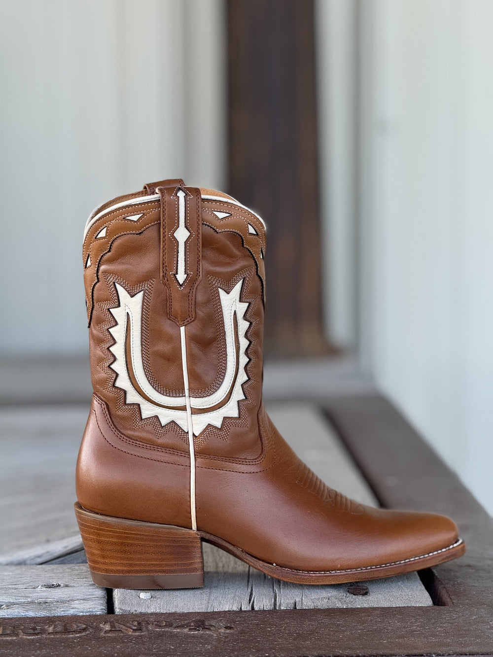 Vamp: Caramel Cowhide | Top: Caramel/Bone Cowhide | Inlay: Horseshoe-inspired Bone Cowhide | Retro collar cutouts | Color: Brown/Brown | Top Height: 9" | Toe: O | Sole: Oiled Leather | Insole: Leather  | Signature Toe Bug | SKU: W20016CMB