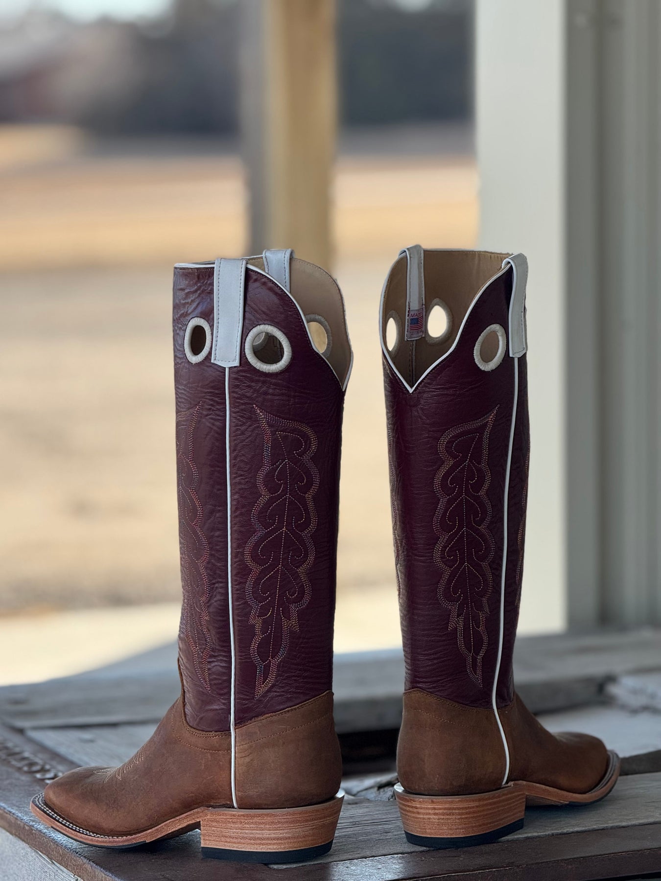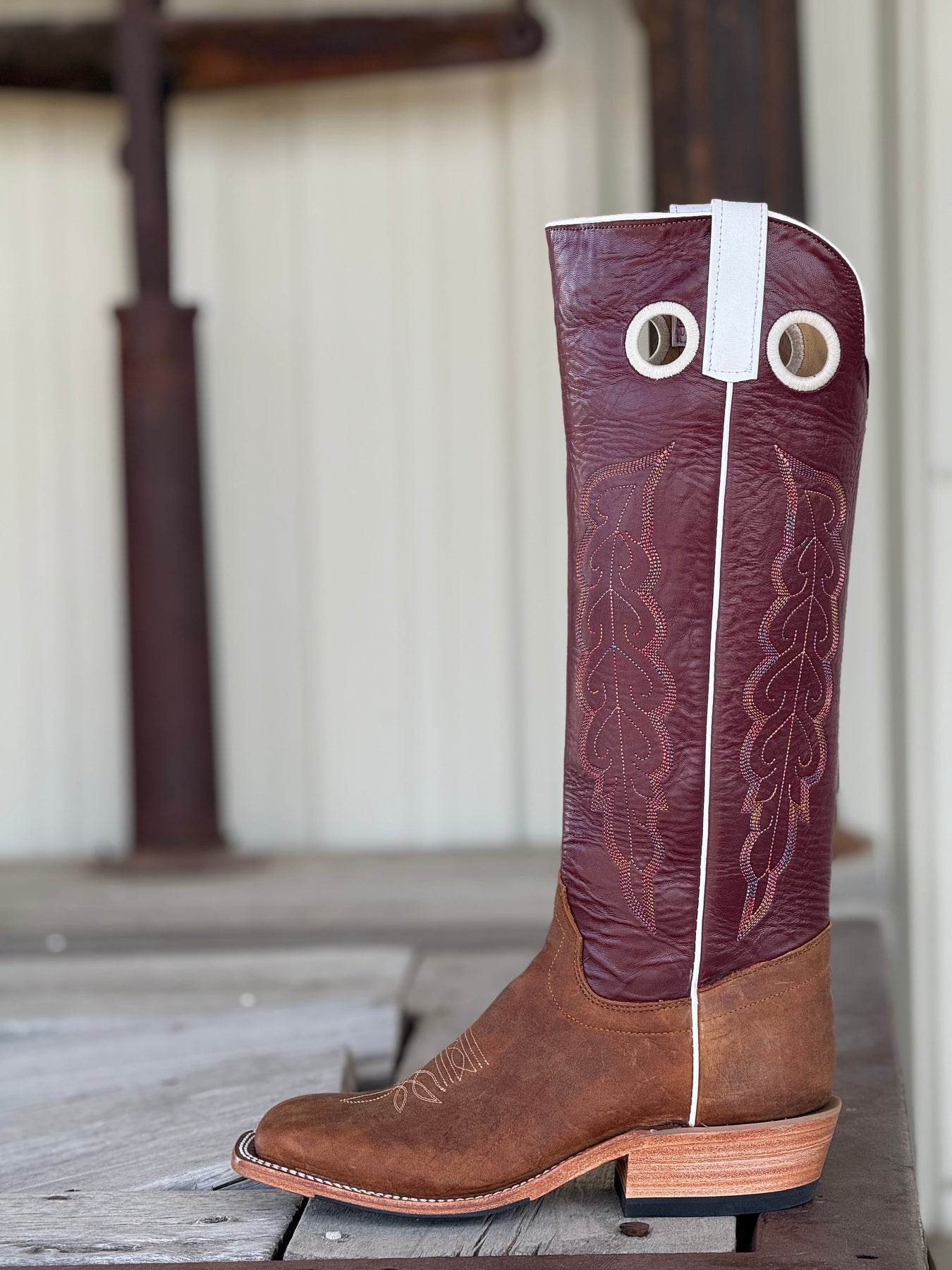 Outpost Exclusive Olathe Tall Top with Brahma Bison Vamps and 17" Sangria Kidskin Tops. This boot is built tough from the sole up! Hybrid soles are one of the toughest options when it comes to sole treatments. Pair them with a neoprene midsole and you have an extremely sturdy boot. Bison hide vamps are the perfect blend of comfort and durability, and they are easy to care for. This boot is made for hard work and just so happens to look absolutely gorgeous!