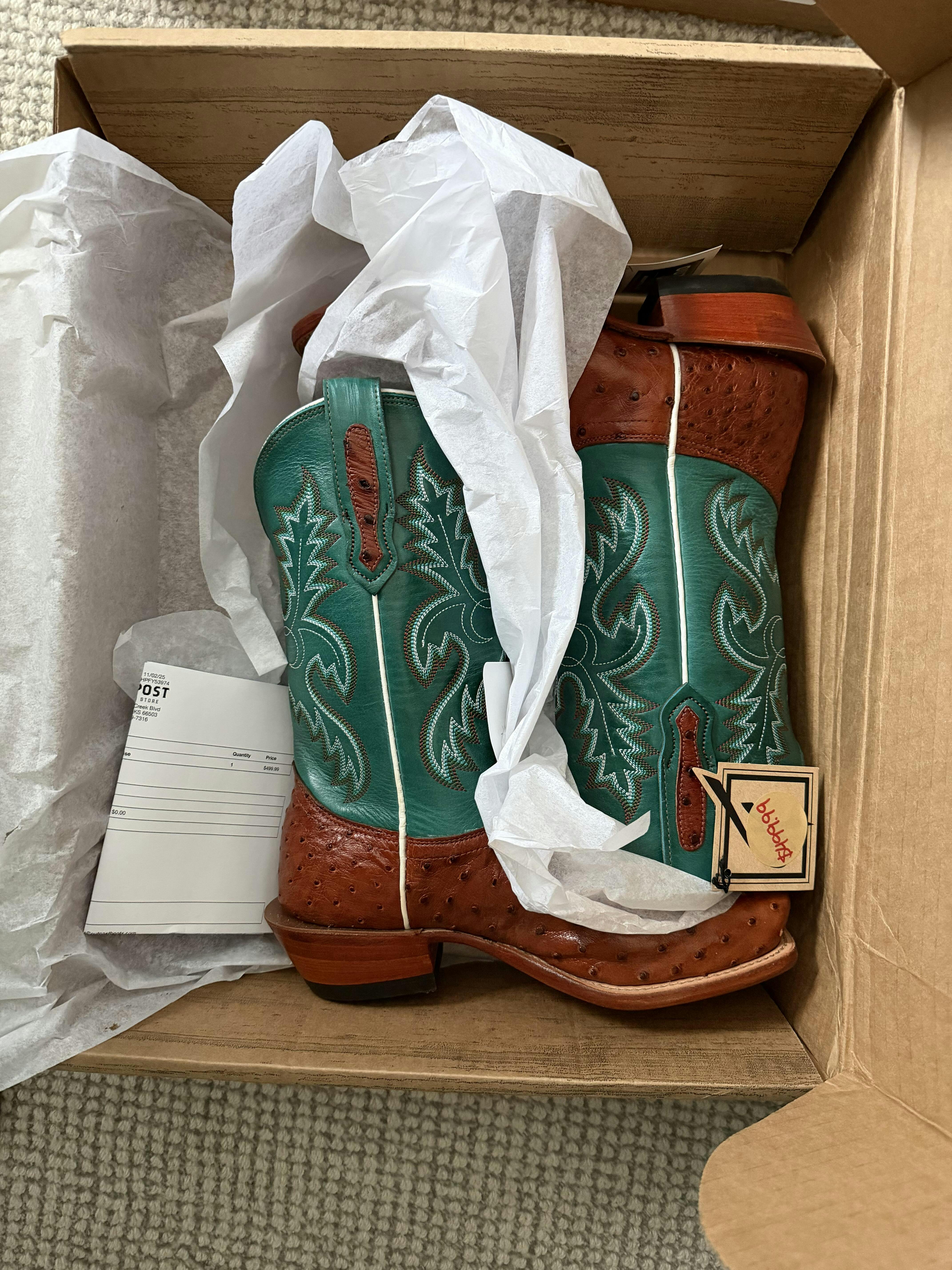 Vamp: Cognac Full Quill Ostrich | Top: Turquoise Eagle | Color: Turquoise | Top Height: 11" | Toe: 0 Toe | Heel: C | Sole: Leather | Proudly made in the USA | SKU:19191933